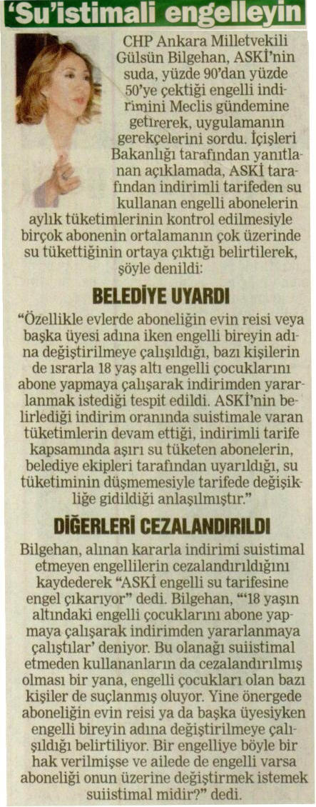 Engellilere yönelik su indiriminin azaltılmasına ilişkin açıklama – Posta Ankara – 3 Ağustos 2014